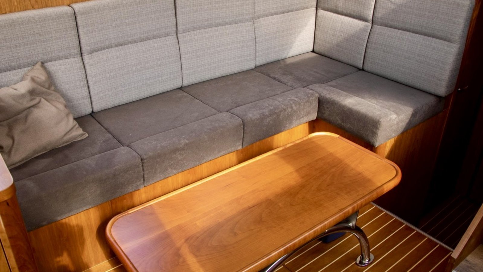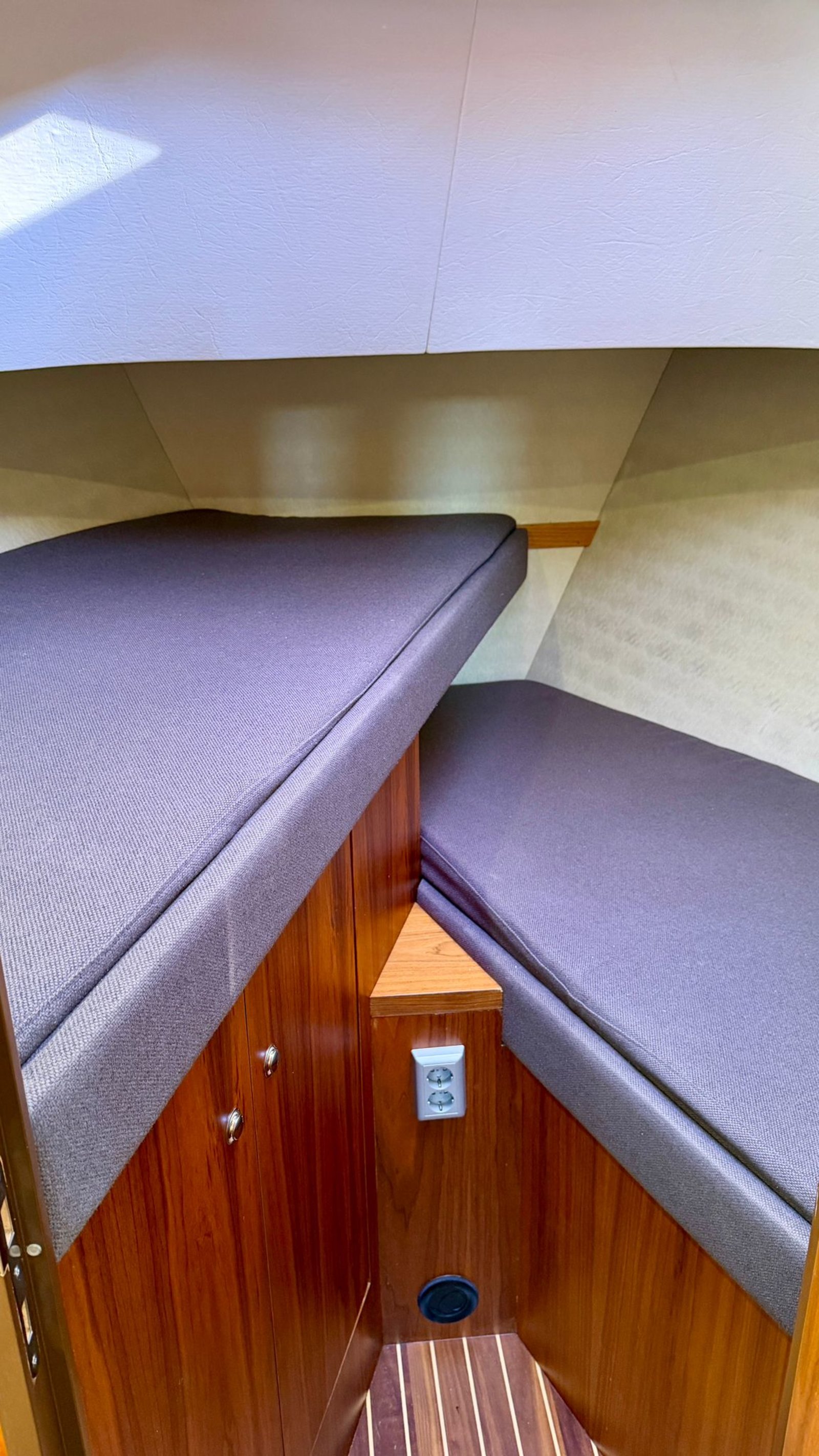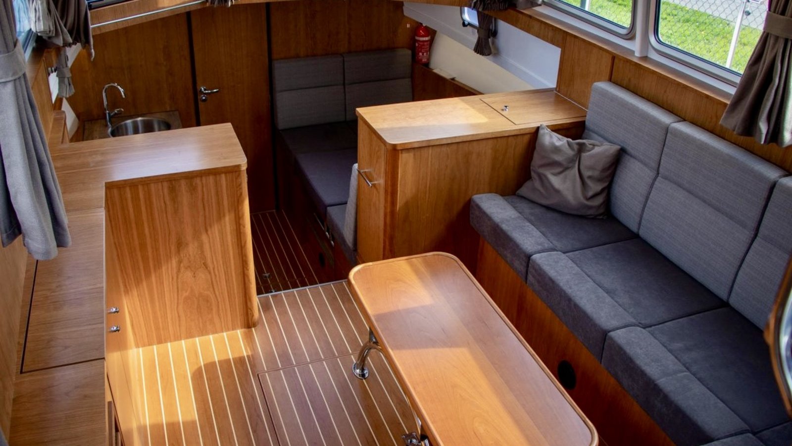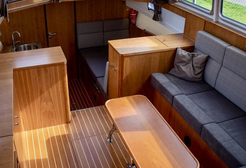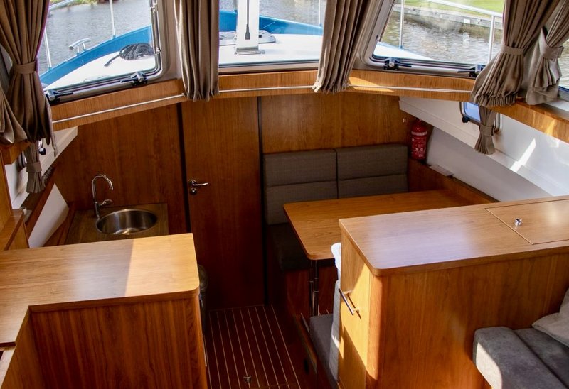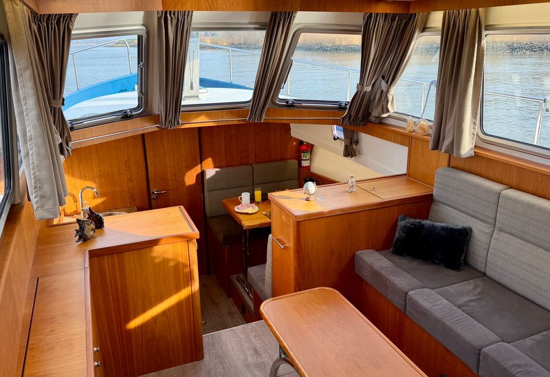 Aan boord is ruimte voor 4 tot 6 personen. Binnen is het licht en ruim opgezet met een comfortabele salon en goed zicht rondom. Voorin bevindt zich een ruime hut met tweepersoonsbed en daarnaast bevindt zich achterin een tweede hut.