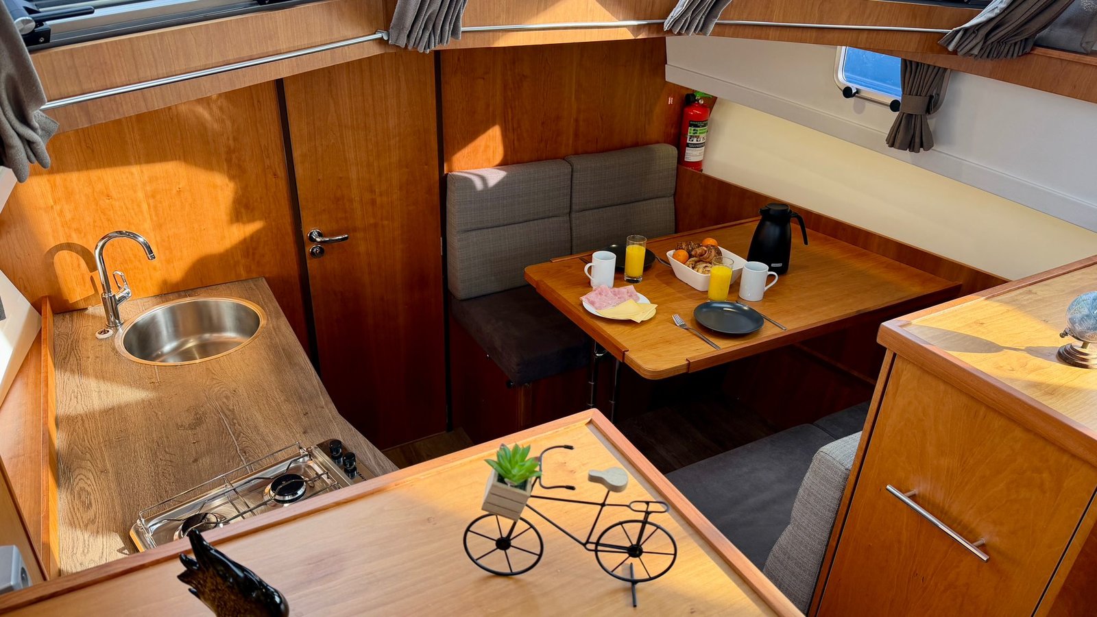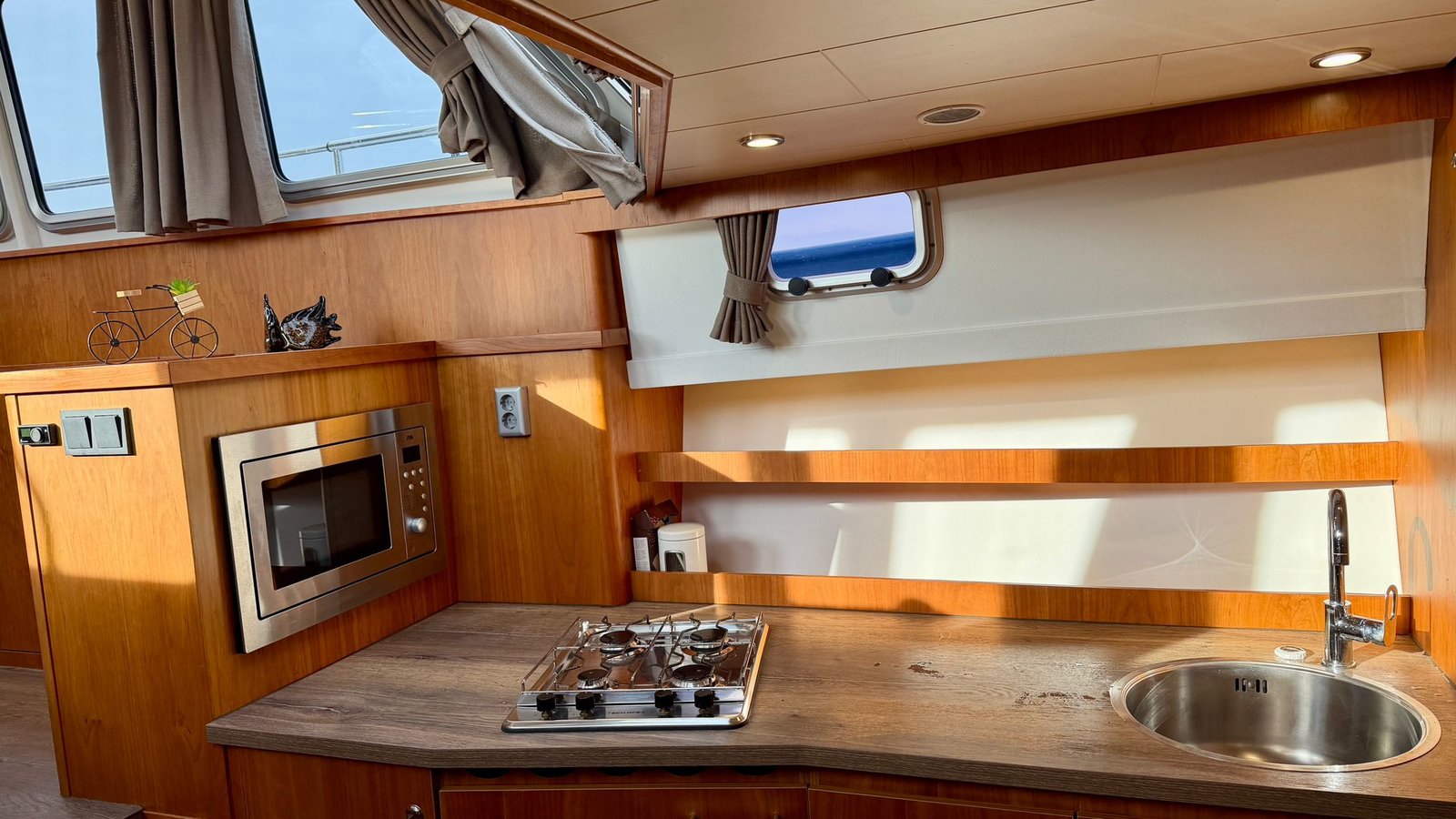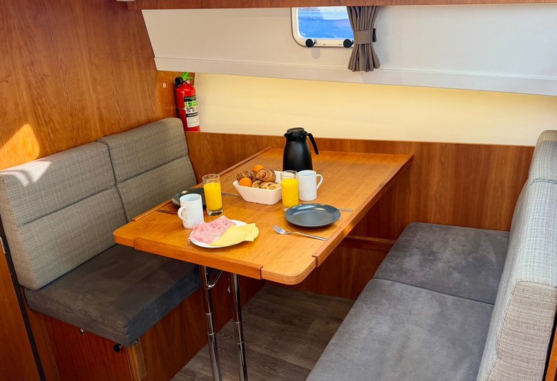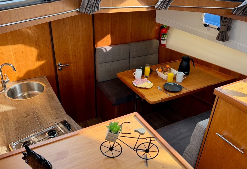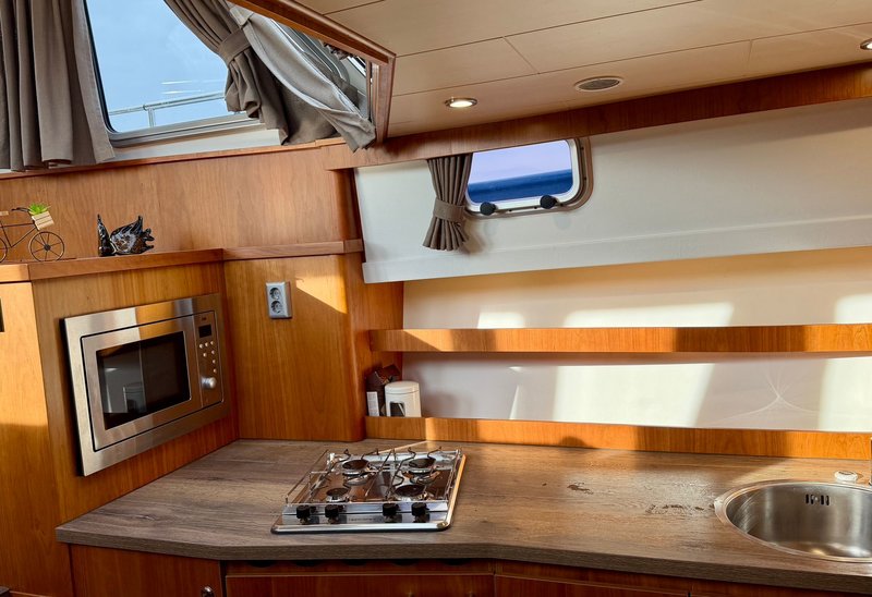 De keuken is praktisch ingericht en geschikt voor dagelijks gebruik tijdens de vaarvakantie. De badkamer beschikt over een toilet, wastafel en douche. Warm water en verwarming zorgen ervoor dat het ook bij minder mooi weer comfortabel blijft aan boord.